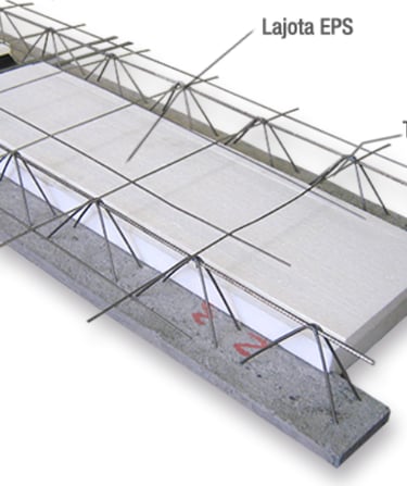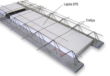 Nesse tipo de laje o enchimento é de poliestireno expandido (EPS), também conhecido como isopor. Esse material garante maior isolamento térmico e acústico, torna a estrutura mais leve e portanto gera economia na fundação e no escoramento da edificação.